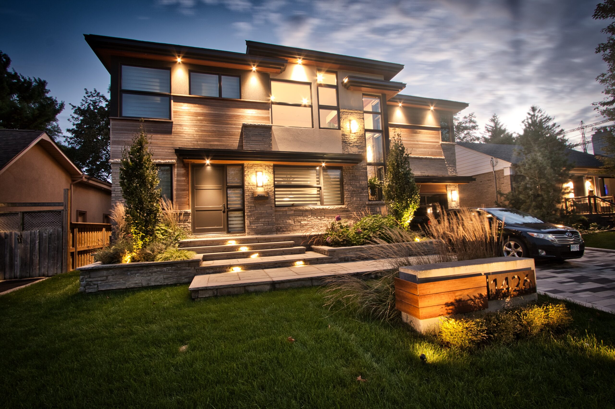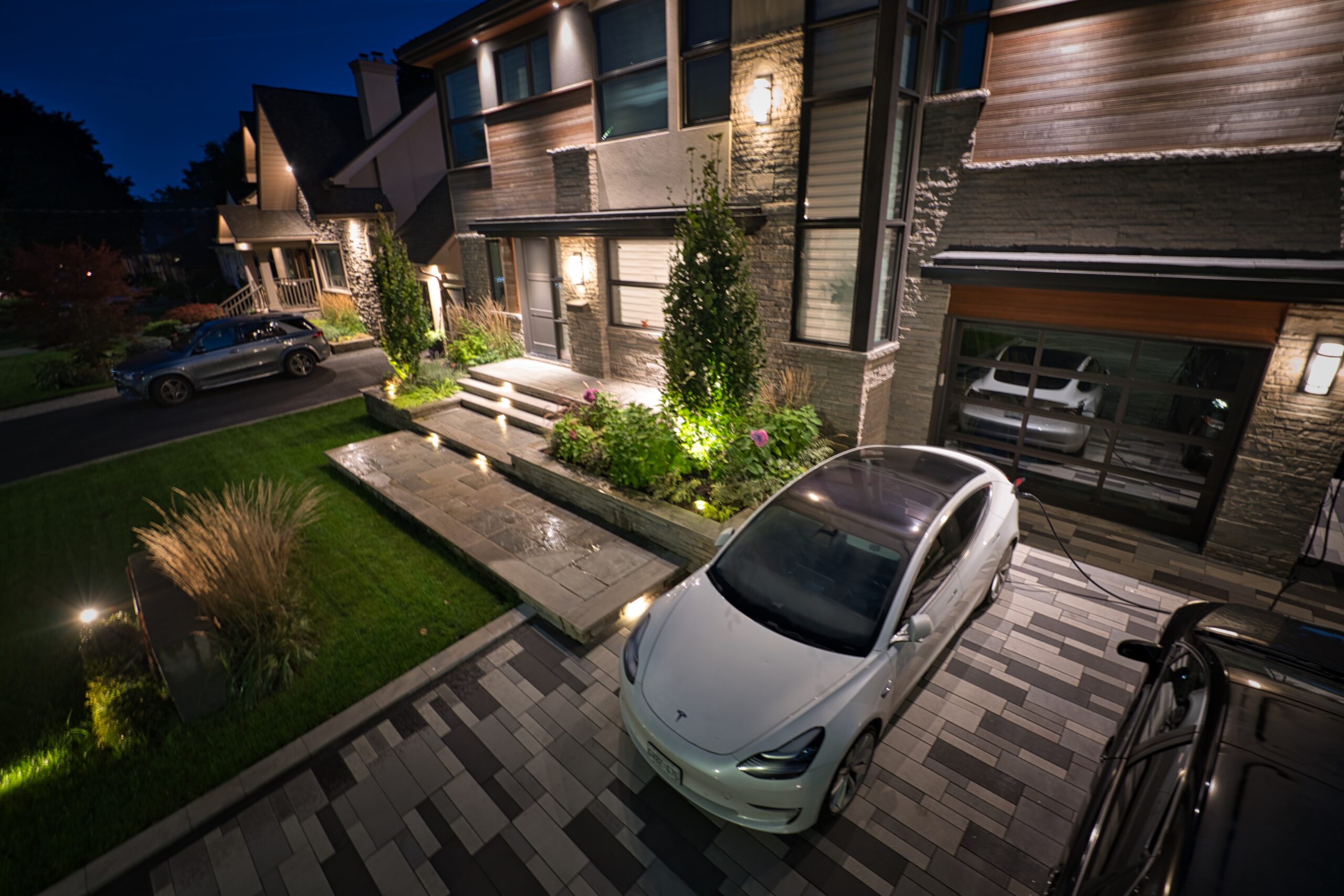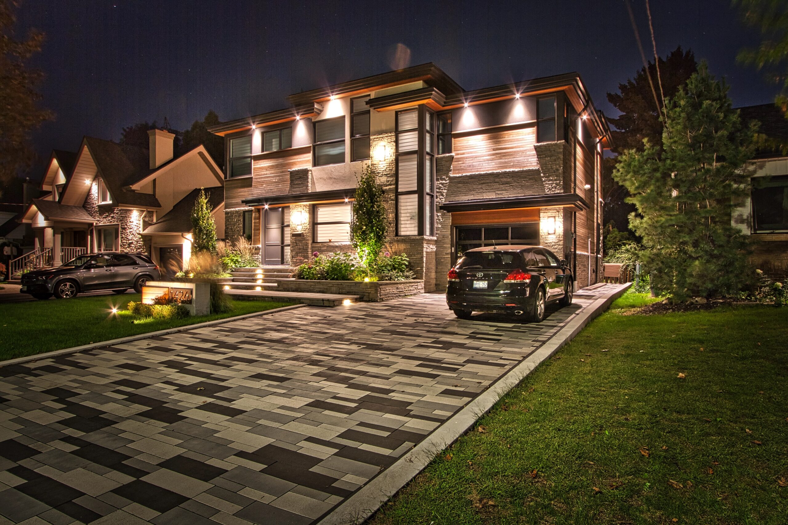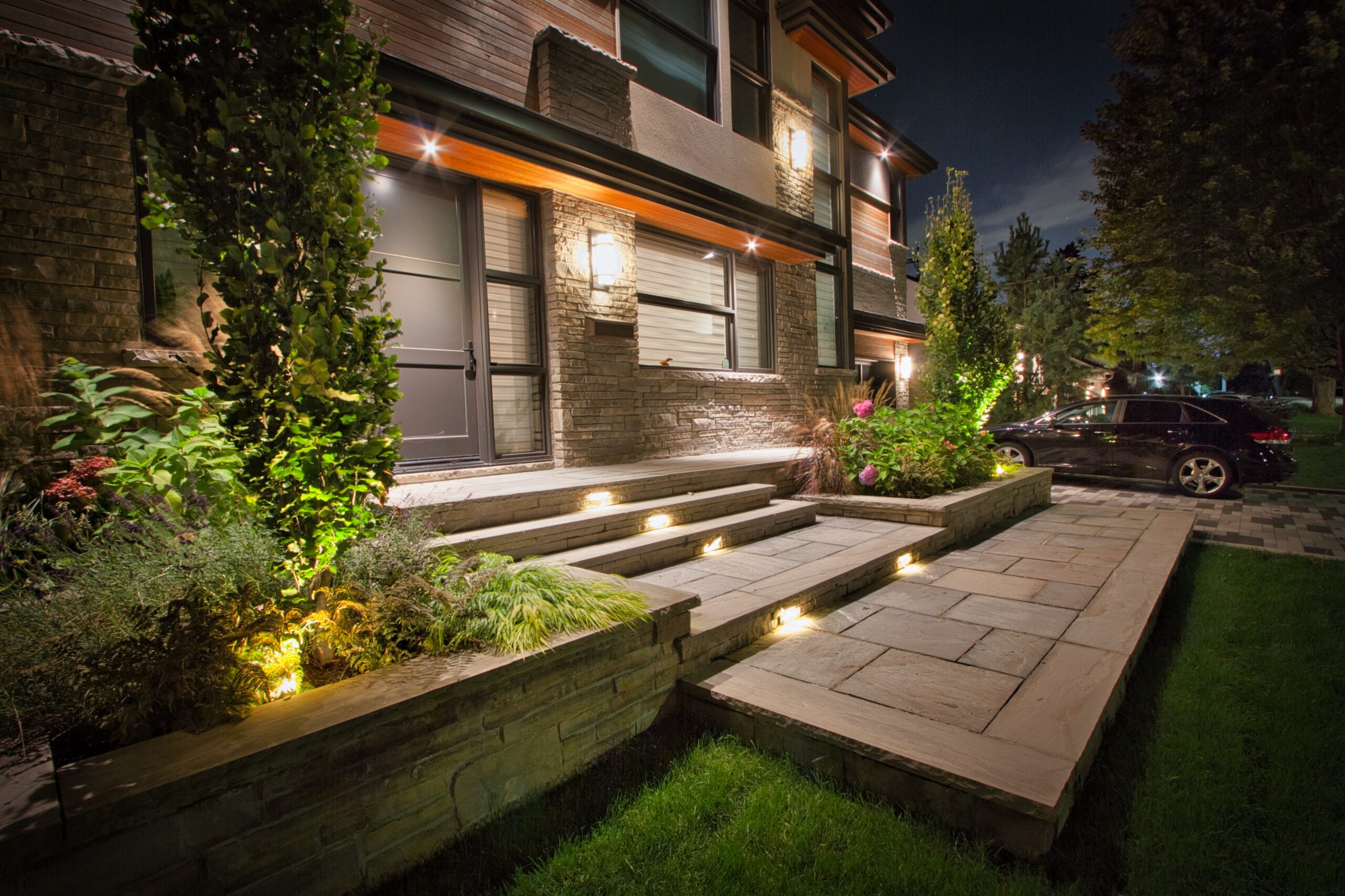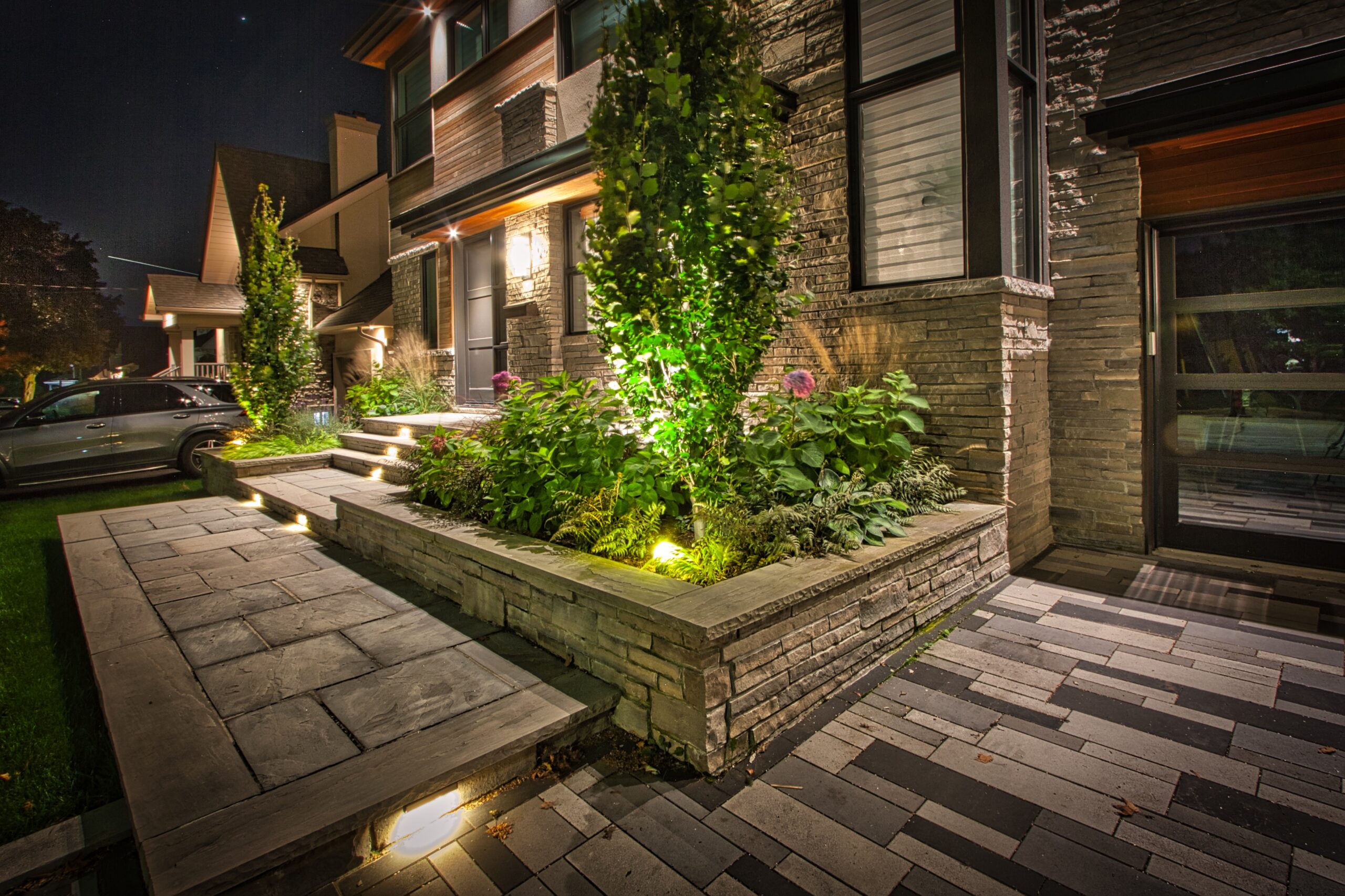 Modern front yard in Mississauga with multi-landing Banas stone porch, columnar tree planters, artistic stone driveway, and architectural lighting.