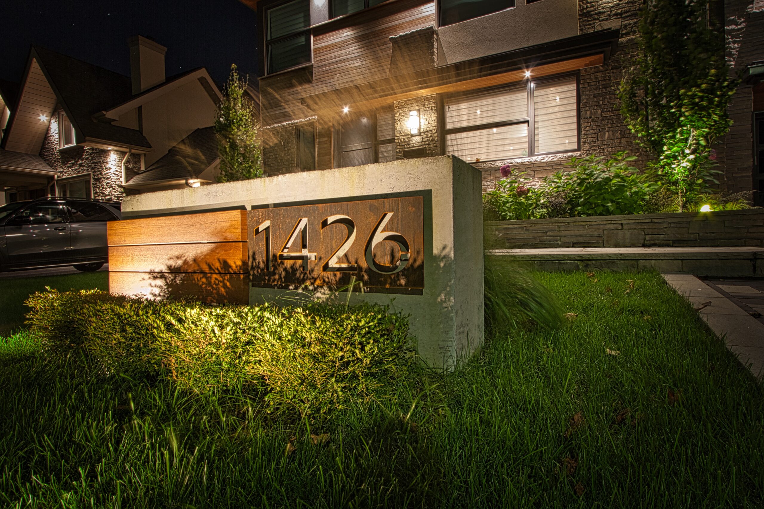 This modern front yard was fully designed and built by our team to complement the clean architectural lines and natural stone façade of the home. The entry experience is elevated through a multi-landing front porch crafted from premium Banas natural stone, breaking up the elevation with subtle steps that feel both functional and artistic. Large planters with mature columnar trees frame the space, enhancing curb appeal and adding a grand, luxurious feel. The driveway features a highly unique stone pattern with mixed colours and sizes, creating a one-of-a-kind design that ties the entire front yard together. With thoughtfully placed lighting highlighting the gardens, steps, and the home itself, this front yard shines day and night.
