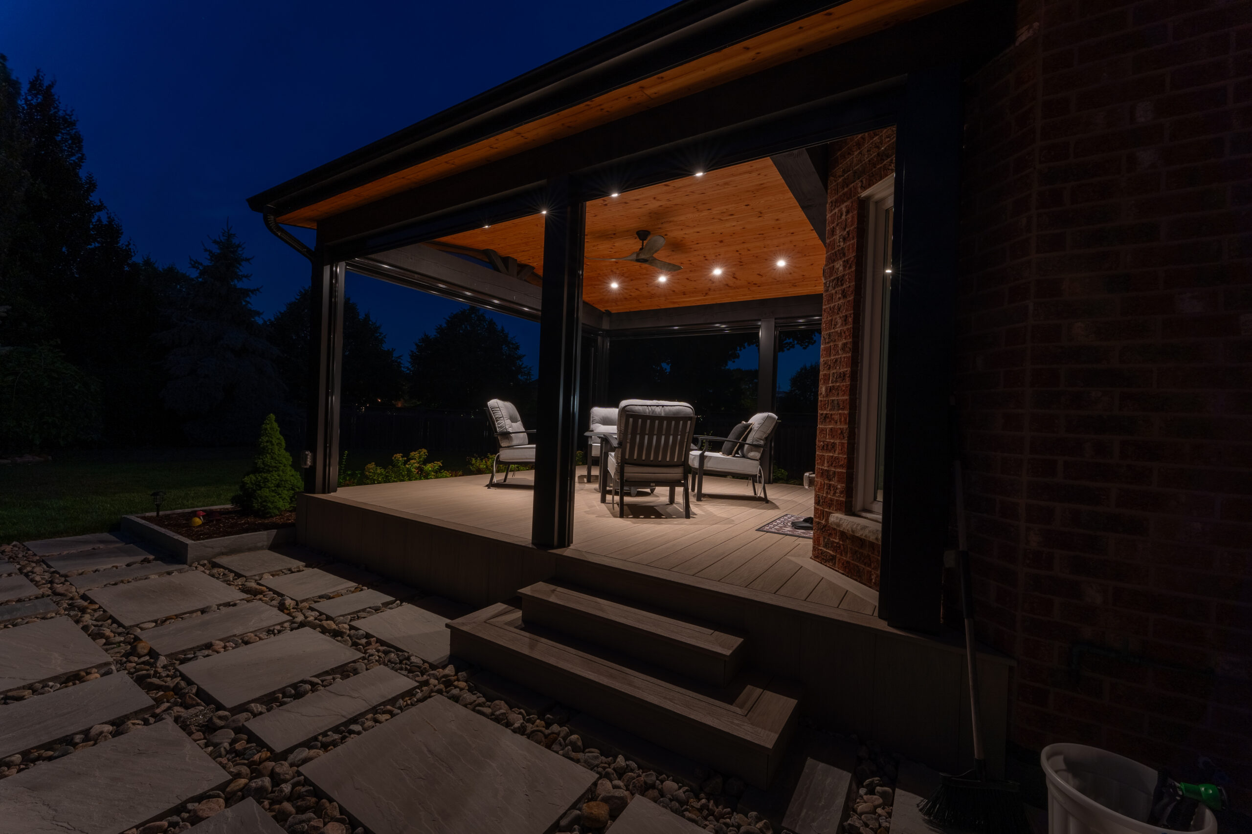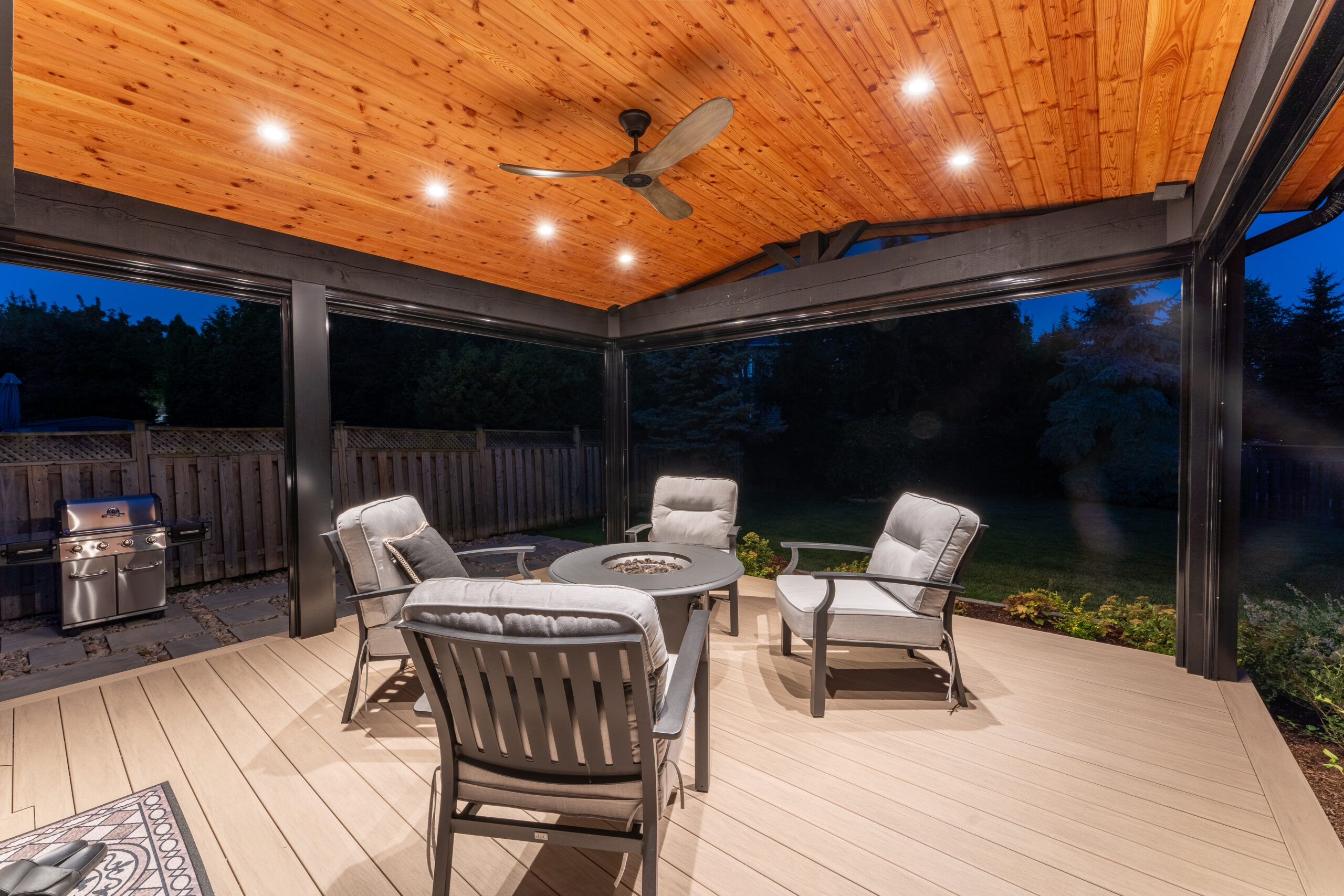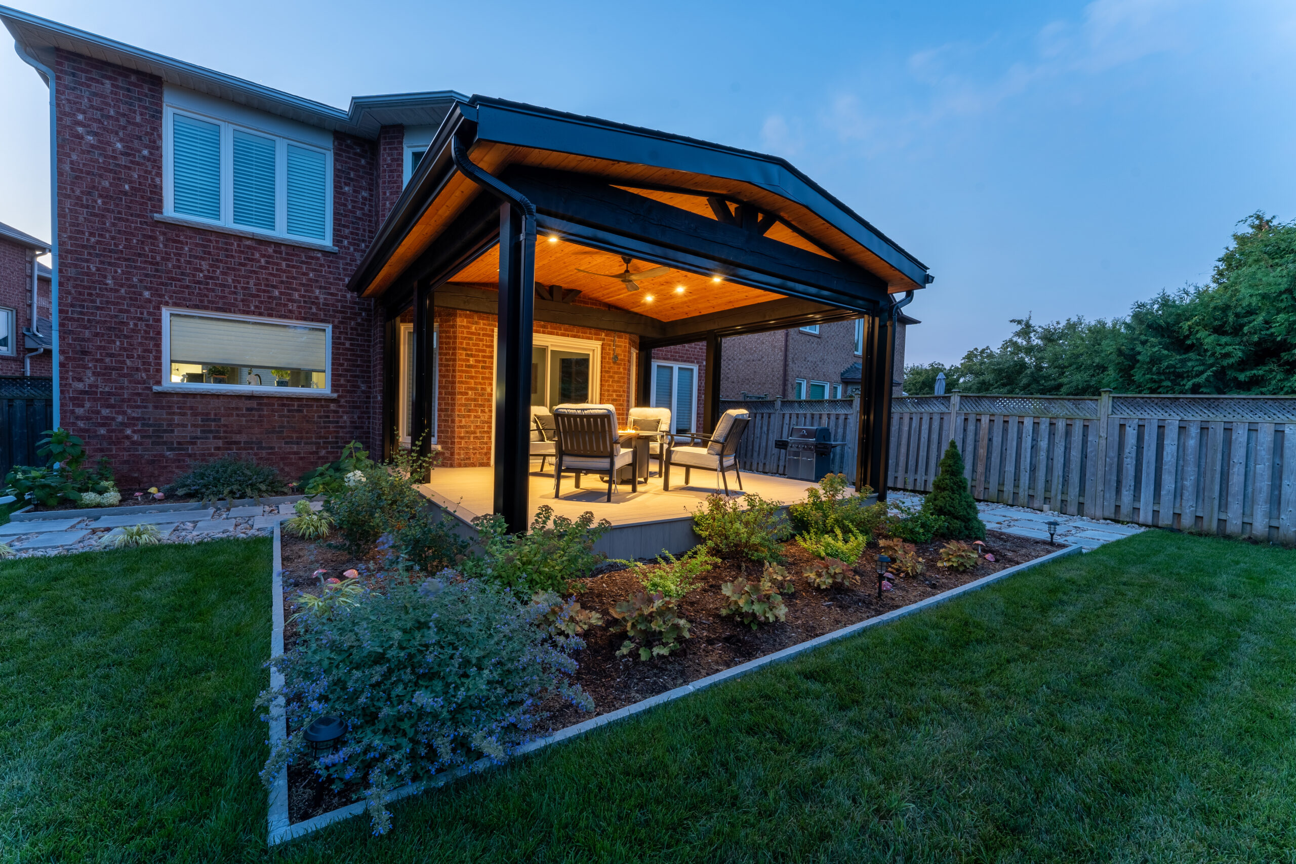 This Oakville backyard was transformed into a seamless extension of the home’s interior. A Wolf PVC deck flows directly from the patio door, creating a durable and elegant outdoor living space. A beautifully crafted timber roof structure with wood ceilings and integrated lighting provides a warm, inviting atmosphere both day and night, while motorized bug screens make the space comfortable through all seasons. With unobstructed views of the expansive backyard — thanks to the no-railing design — this elevated outdoor retreat blends perfectly into the surrounding greenery. Natural stone elements provide a dedicated BBQ or lounging area, complemented by thoughtfully designed planting beds and evening lighting that bring the space to life.