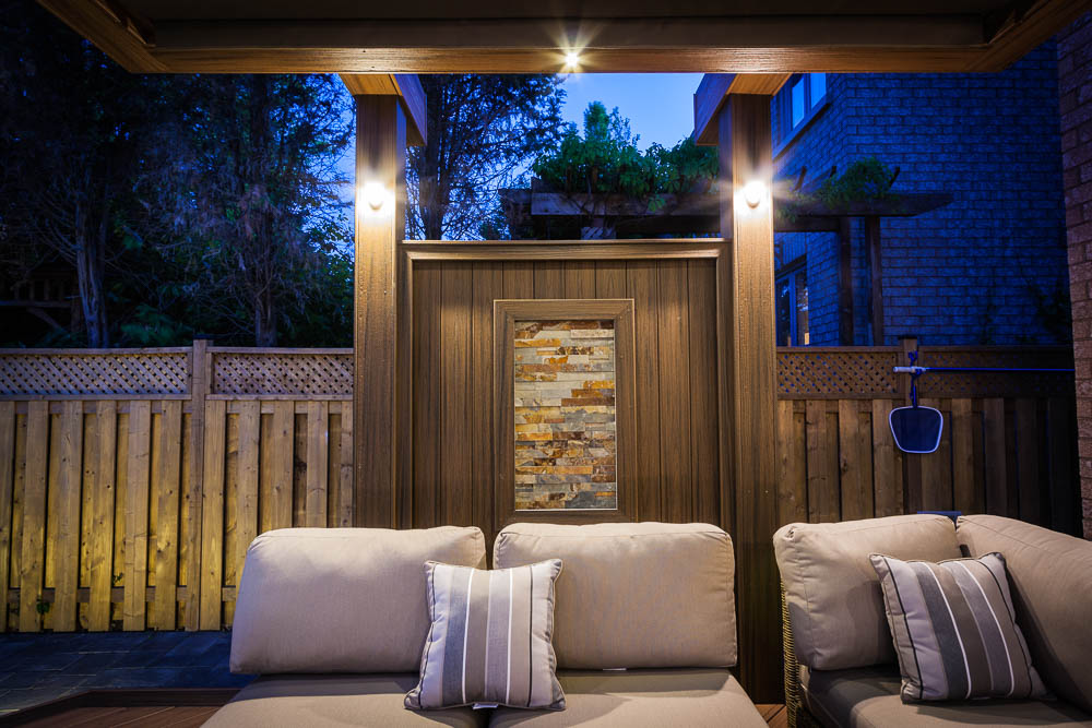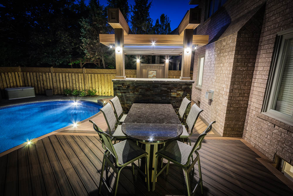 This Mississauga backyard is defined by its signature curved composite deck that follows the shape of a kidney-shaped pool, creating a truly one-of-a-kind outdoor living space. Near the patio door, lighter Trex boards form the main area around the outdoor kitchen, while darker boards provide contrast and help separate functional zones. A custom curved bench enhances the flow of the deck. On the opposite side, colours reverse to further distinguish the seating area, which features a stone fireplace and a modern pergola with a retractable ShadeFX awning. Unilock stone surrounds the pool, complemented by lush gardens and tasteful lighting that transforms the entire space into a serene city oasis at night.