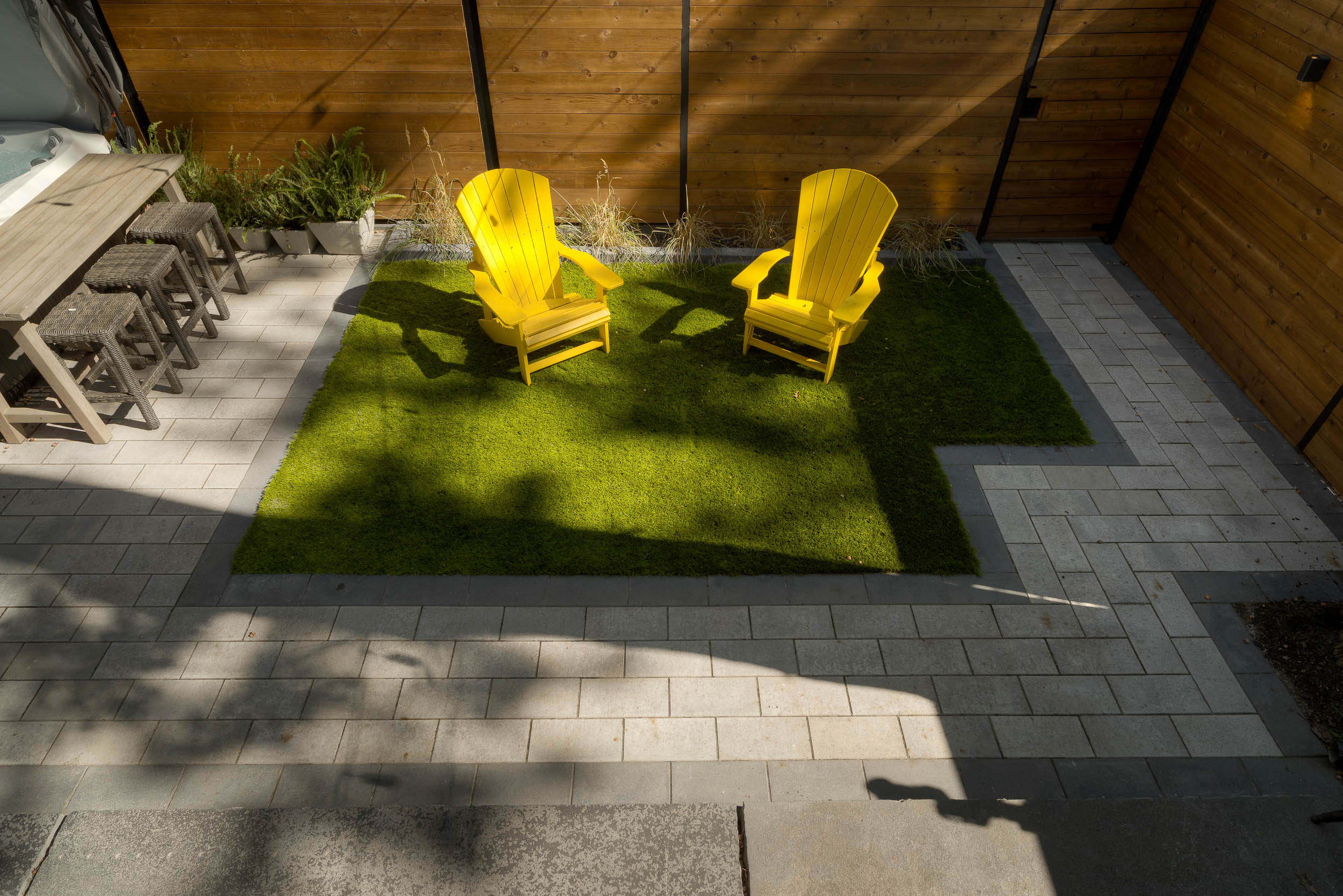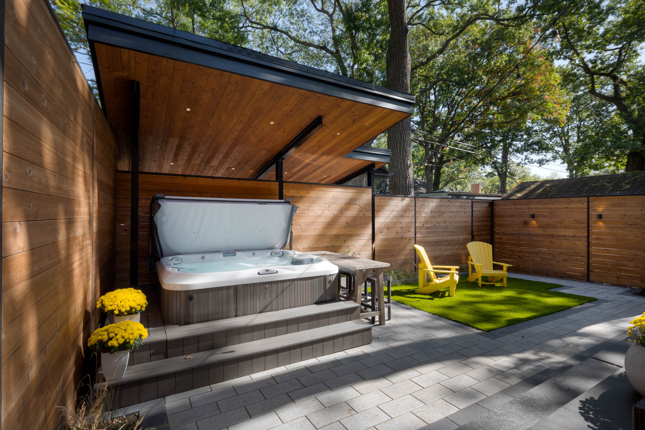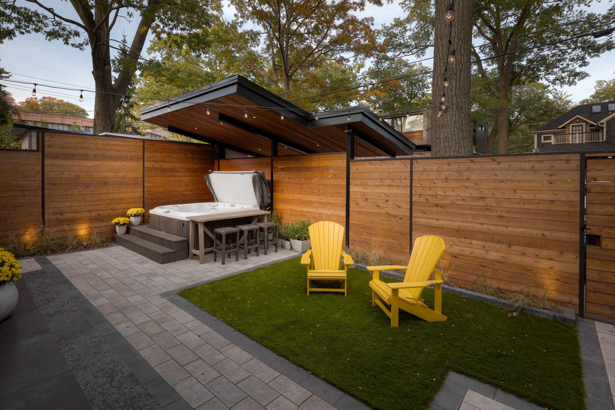 This Toronto backyard was fully designed and built by our team to meet a very specific challenge: the client wanted both a covered hot tub area and a carport, but zoning restrictions limited how much structure could be added. Our solution was a single, elegant roof system that serves both purposes while requiring only two support posts—keeping the space open, functional, and architecturally striking. The backyard features a modern aesthetic tailored to a professional lifestyle, combining clean stonework, artificial turf, and thoughtful lighting for evening enjoyment. The result is a low-maintenance, highly functional outdoor space that feels organized, contemporary, and effortlessly usable.