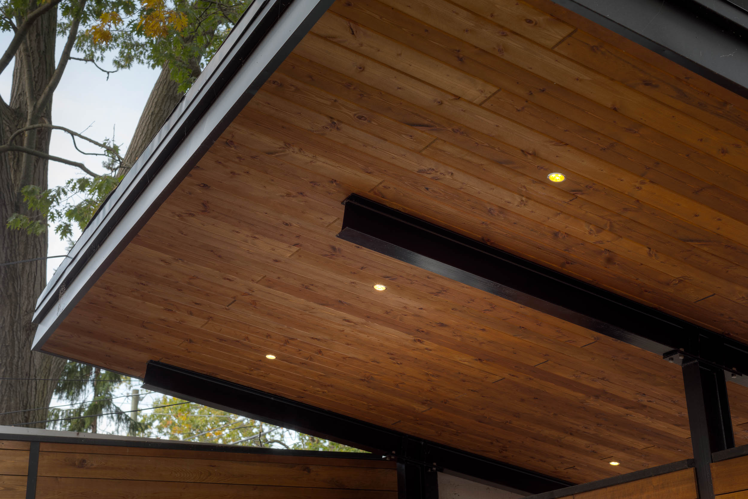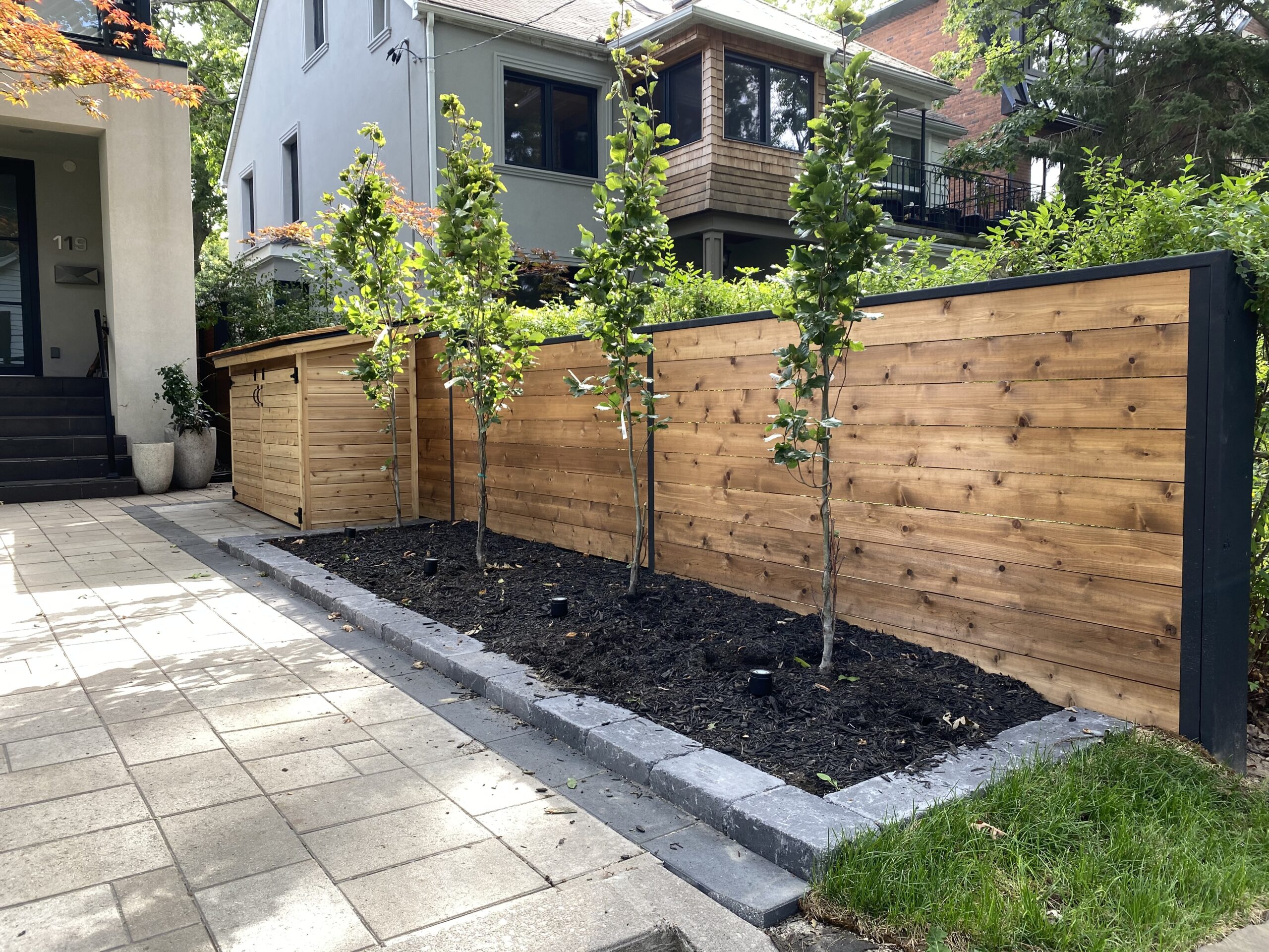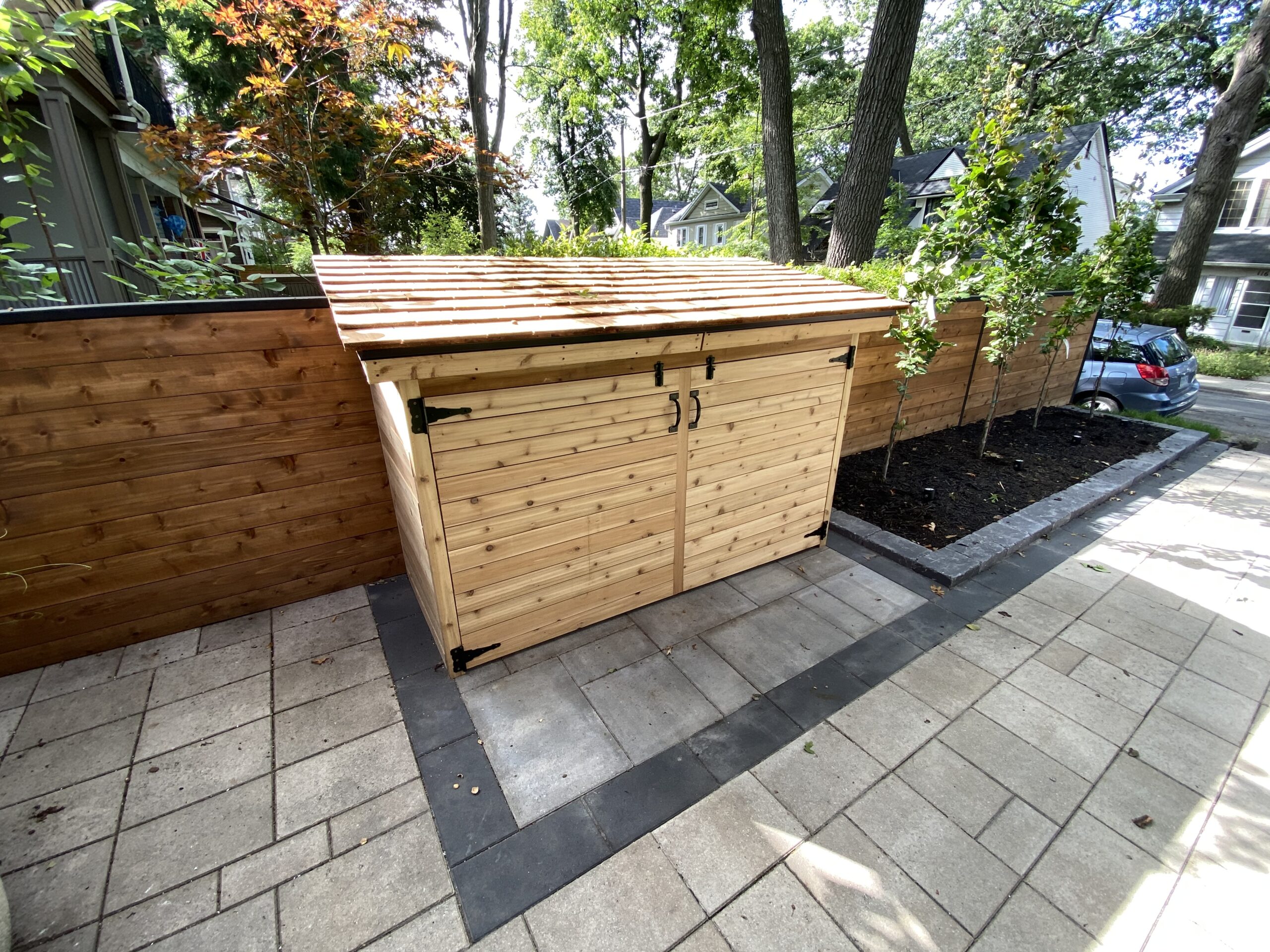This Toronto backyard was fully designed and built by our team to meet a very specific challenge: the client wanted both a covered hot tub area and a carport, but zoning restrictions limited how much structure could be added. Our solution was a single, elegant roof system that serves both purposes while requiring only two support posts—keeping the space open, functional, and architecturally striking. The backyard features a modern aesthetic tailored to a professional lifestyle, combining clean stonework, artificial turf, and thoughtful lighting for evening enjoyment. The result is a low-maintenance, highly functional outdoor space that feels organized, contemporary, and effortlessly usable.