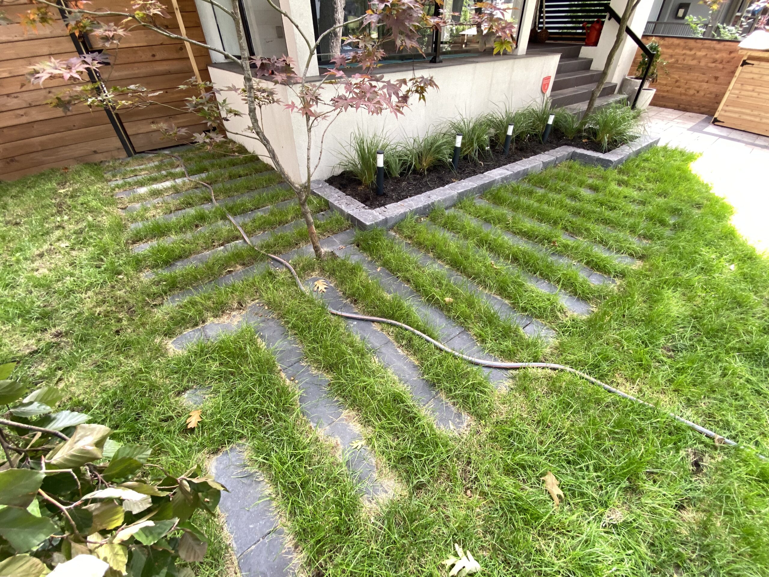 - Combination of stonework and artificial turf for durability and style