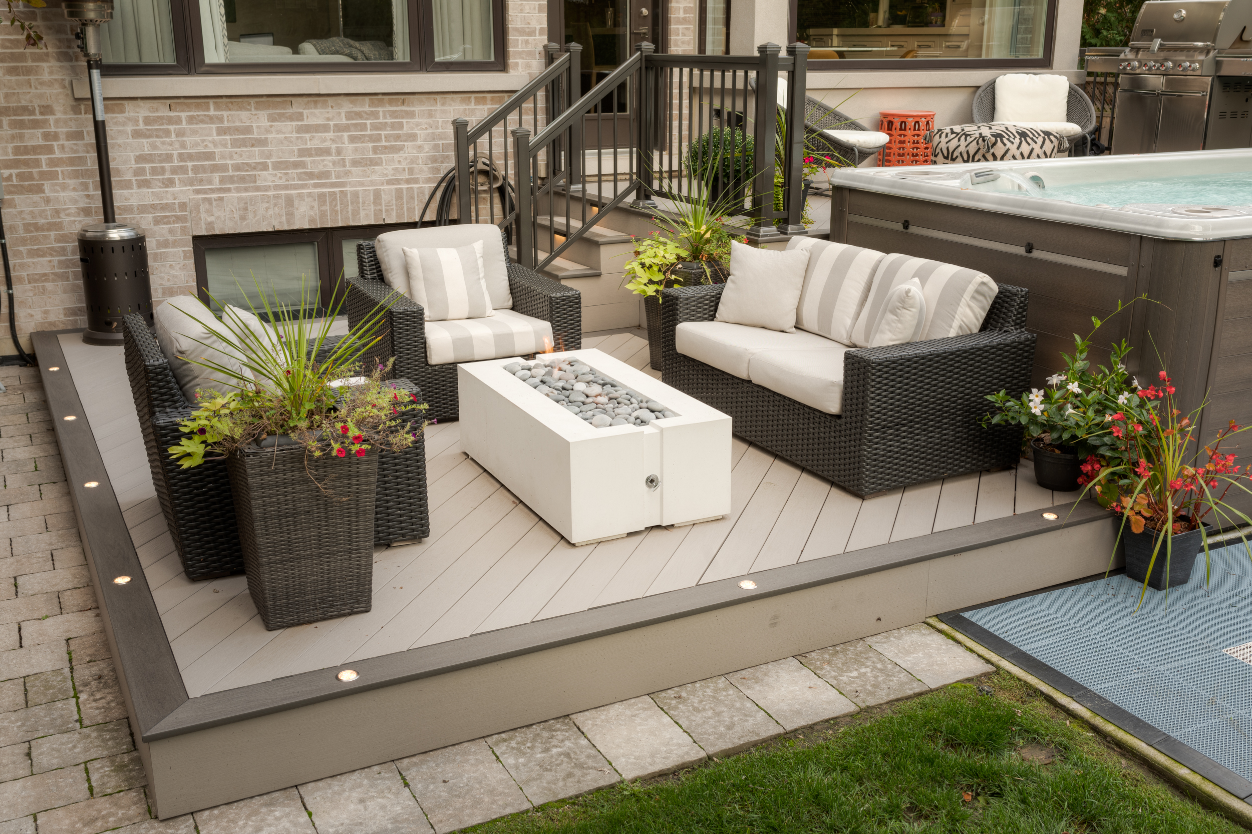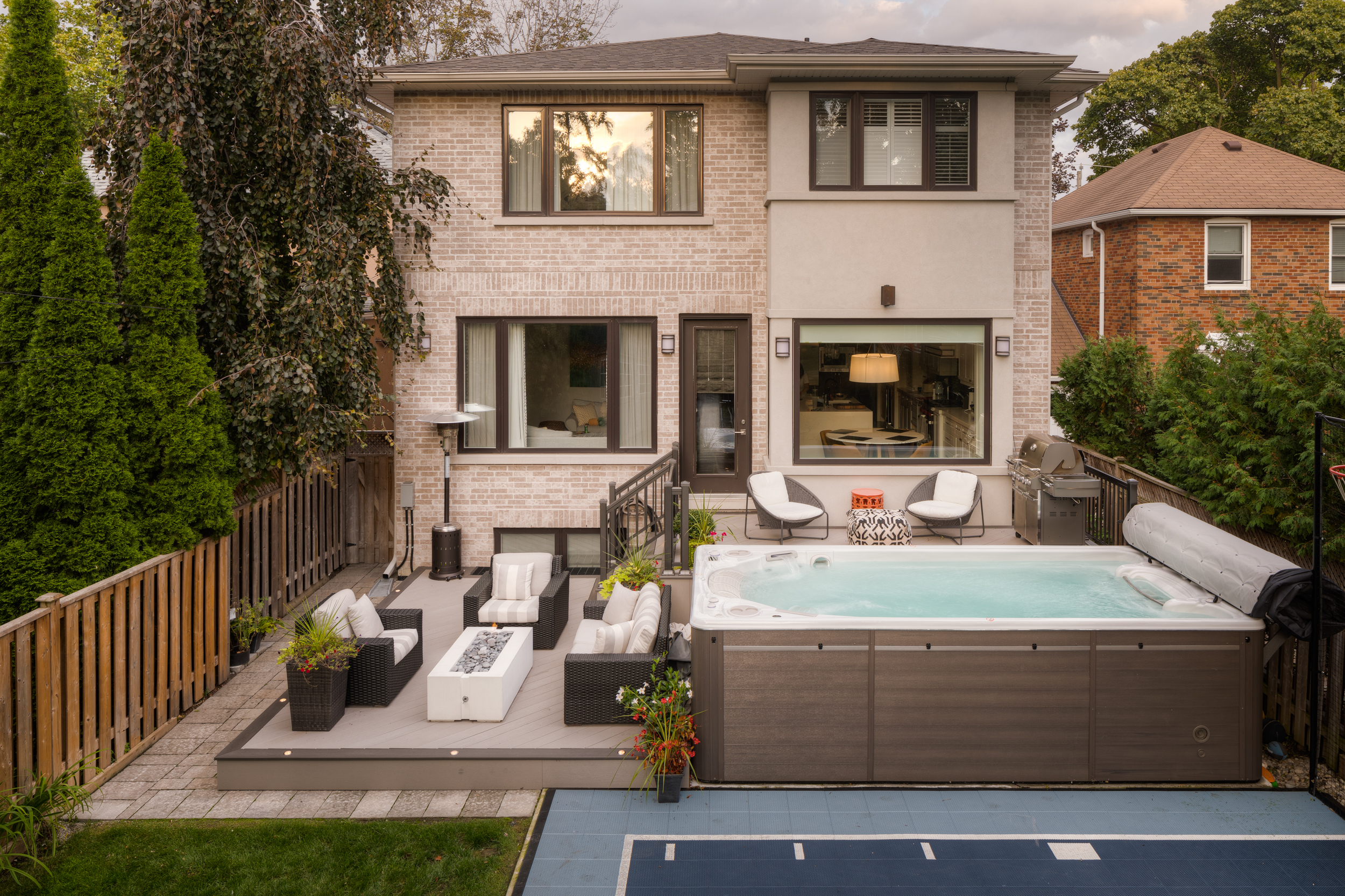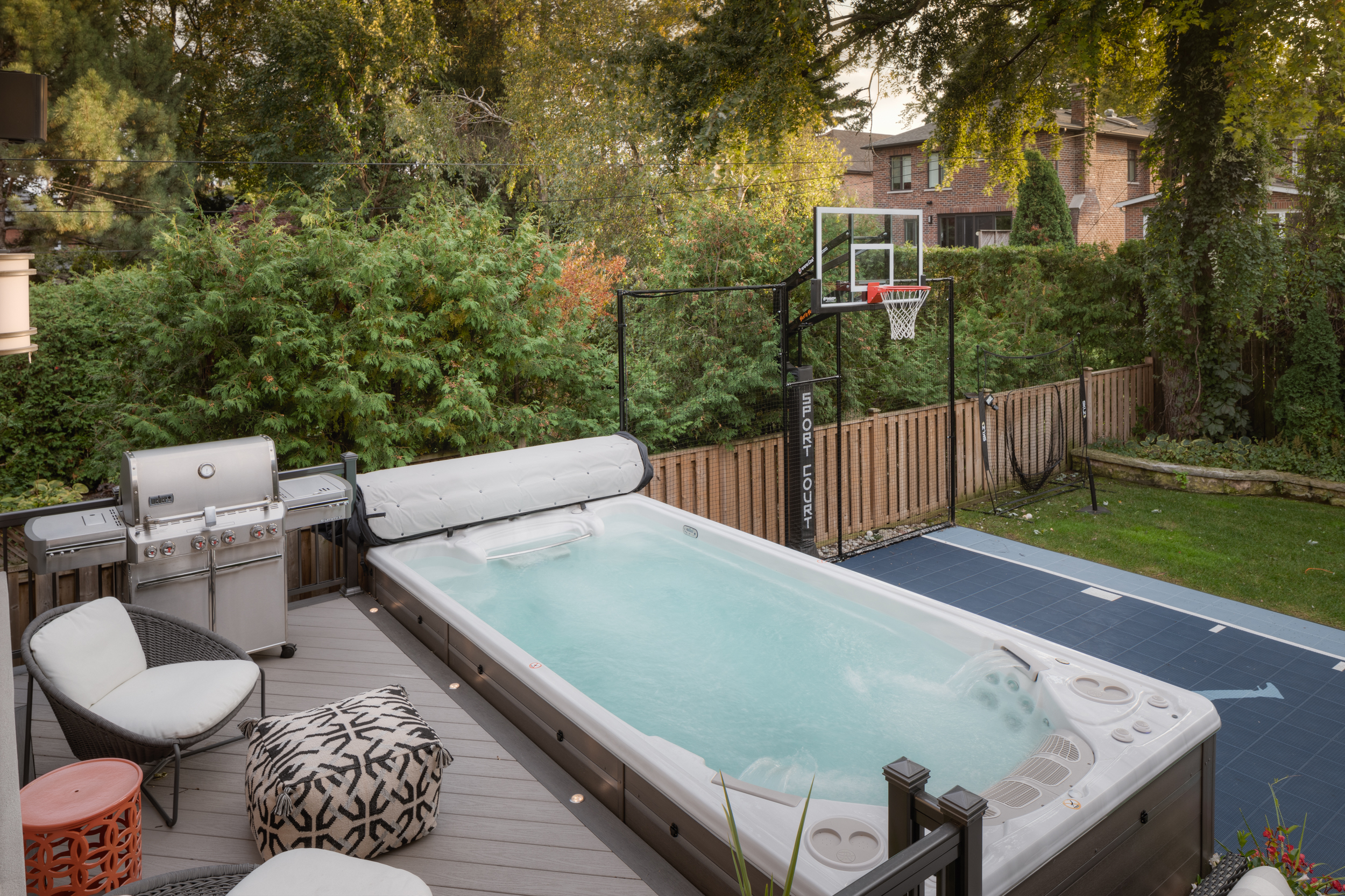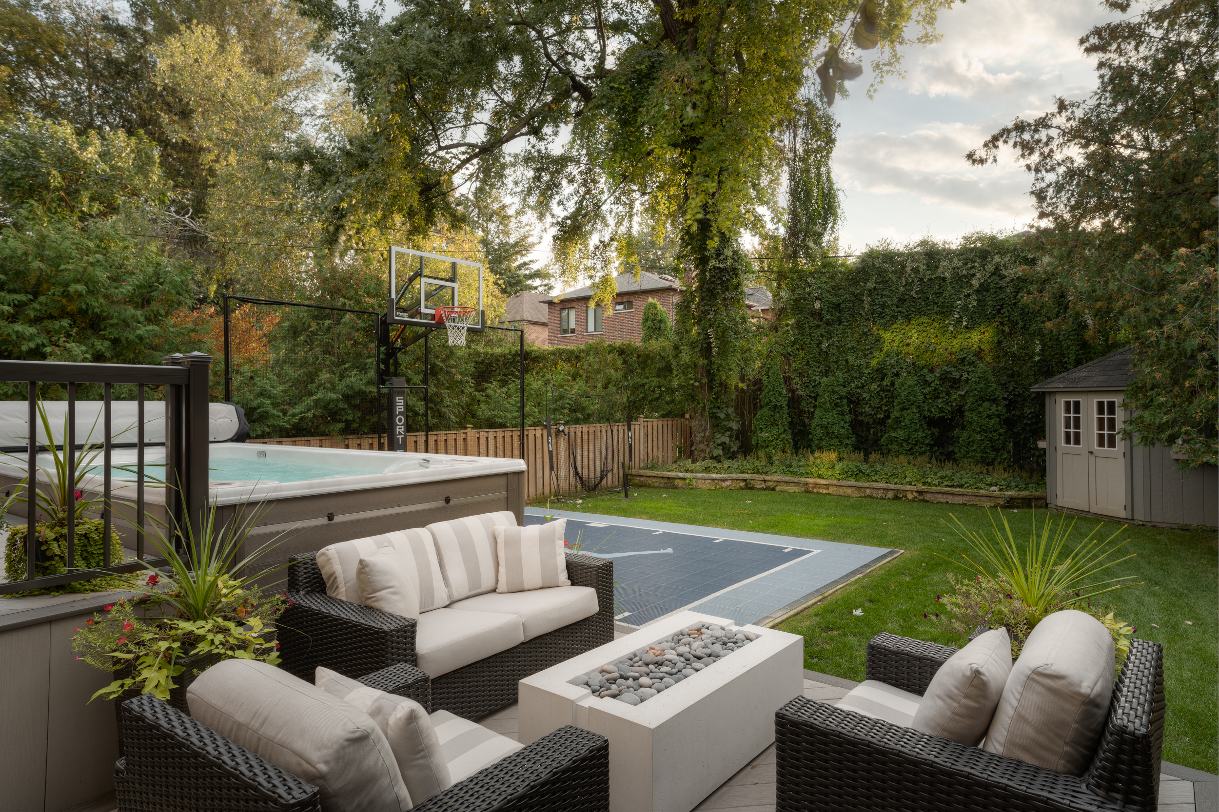 This Toronto backyard was fully designed and built by our team to create a seamless indoor–outdoor experience anchored by a beautifully crafted two-level Wolf PVC deck. The upper level extends directly from the main floor, providing effortless access to the swim spa and a covered cooking area complete with a BBQ and cozy coffee nook. Just one step off the ground, the lower deck becomes an inviting outdoor living room with a firetable, integrated lighting, and plenty of space to unwind. Surrounded by lush gardens, mature trees, and even a private basketball court, this backyard offers the perfect balance of relaxation, recreation, and modern comfort in the heart of the city.