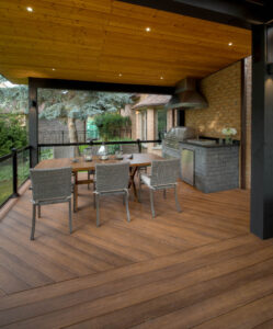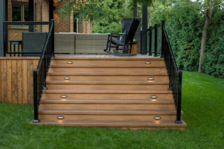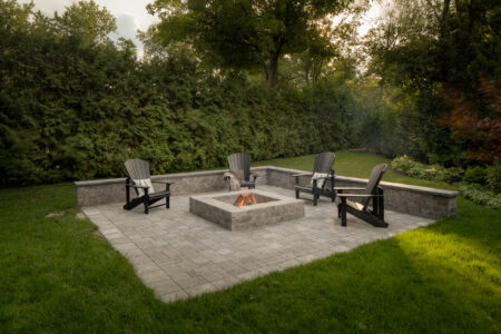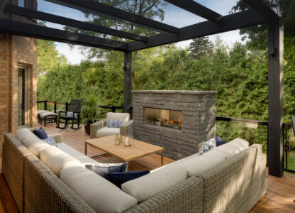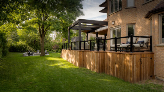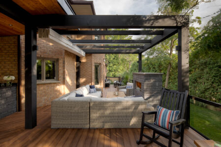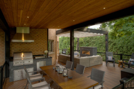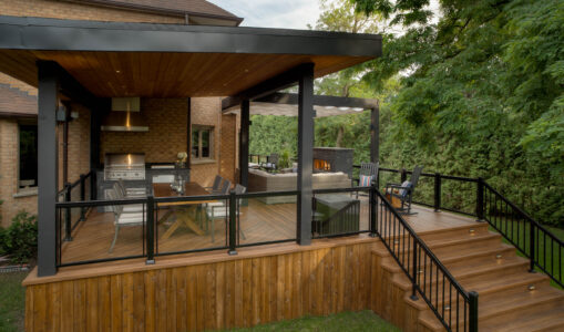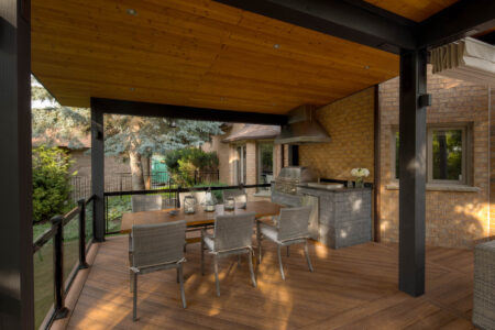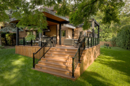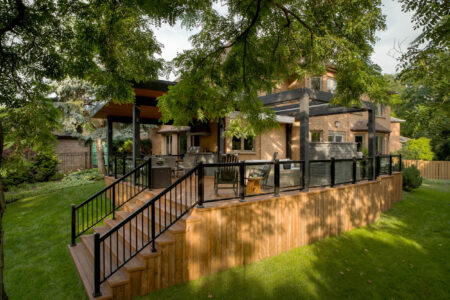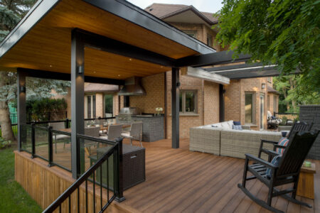 Designed and built by our team, this Mississauga backyard required a highly creative layout to accommodate the client’s wish list while working within zoning restrictions and an unusually shaped lot. The result is a seamless, single-level PVC deck off the main floor that flows into multiple beautifully defined outdoor living zones. A modern timber pergola with a retractable awning shelters a stunning stone fireplace, while a sleek single-sloped roof attached to the house covers a full outdoor kitchen and dining area. Glass railings preserve uninterrupted views of the surrounding greenery, and a ground-level firepit lounge completes this serene backyard retreat.