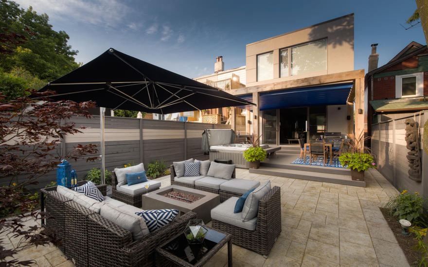 Customer requested very low maintenance backyard with deck, shading, hot tub and fire pit area at this Beaches project.