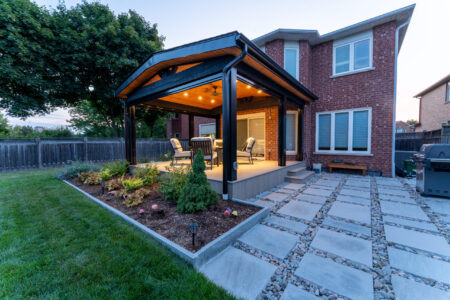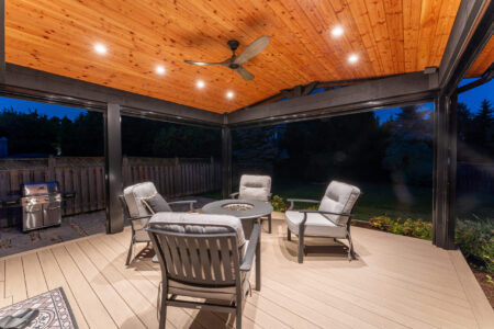 This Oakville backyard was transformed into a seamless extension of the home’s interior. A Wolf PVC deck flows directly from the patio door, creating a durable and elegant outdoor living space. A beautifully crafted timber roof structure with wood ceilings and integrated lighting provides a warm, inviting atmosphere both day and night, while motorized bug screens make the space comfortable through all seasons. With unobstructed views of the expansive backyard — thanks to the no-railing design — this elevated outdoor retreat blends perfectly into the surrounding greenery. Natural stone elements provide a dedicated BBQ or lounging area, complemented by thoughtfully designed planting beds and evening lighting that bring the space to life.