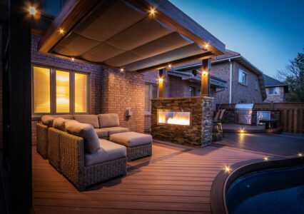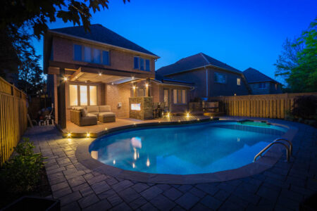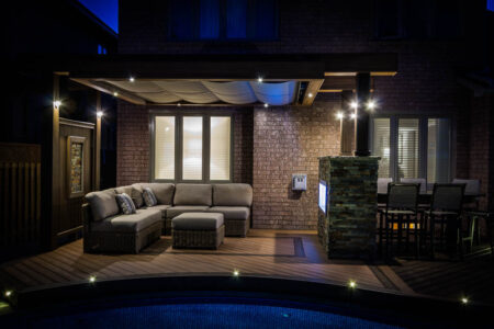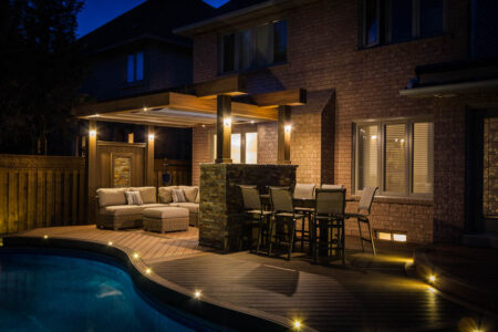 This Mississauga backyard is defined by its signature curved composite deck that follows the shape of a kidney-shaped pool, creating a truly one-of-a-kind outdoor living space. Near the patio door, lighter Trex boards form the main area around the outdoor kitchen, while darker boards provide contrast and help separate functional zones. A custom curved bench enhances the flow of the deck. On the opposite side, colours reverse to further distinguish the seating area, which features a stone fireplace and a modern pergola with a retractable ShadeFX awning. Unilock stone surrounds the pool, complemented by lush gardens and tasteful lighting that transforms the entire space into a serene city oasis at night.