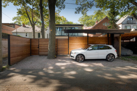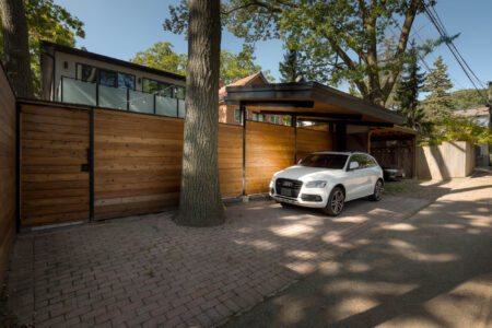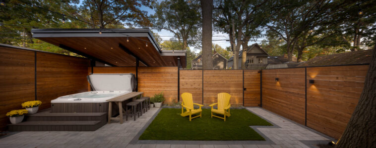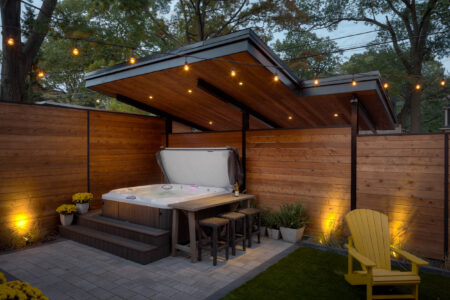 This Toronto backyard was fully designed and built by our team to meet a very specific challenge: the client wanted both a covered hot tub area and a carport, but zoning restrictions limited how much structure could be added. Our solution was a single, elegant roof system that serves both purposes while requiring only two support posts—keeping the space open, functional, and architecturally striking. The backyard features a modern aesthetic tailored to a professional lifestyle, combining clean stonework, artificial turf, and thoughtful lighting for evening enjoyment. The result is a low-maintenance, highly functional outdoor space that feels organized, contemporary, and effortlessly usable.
