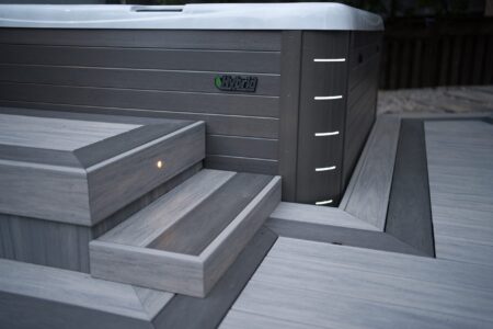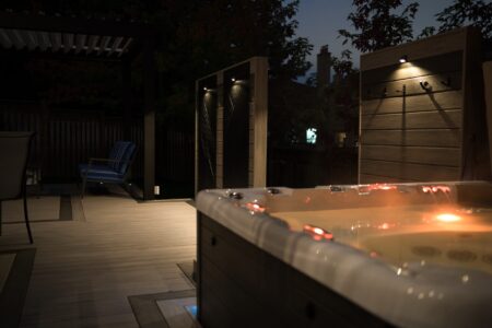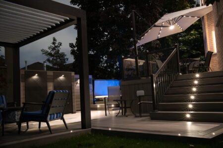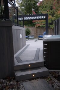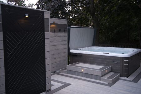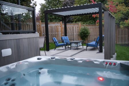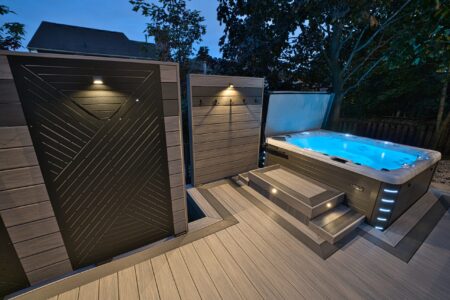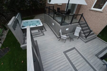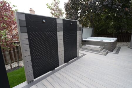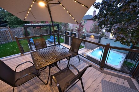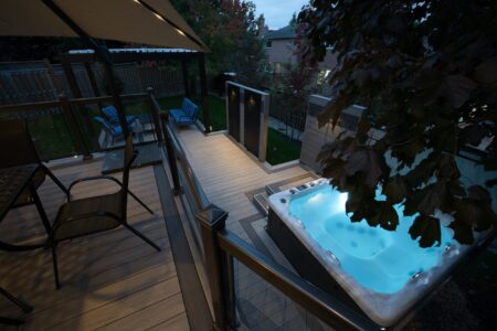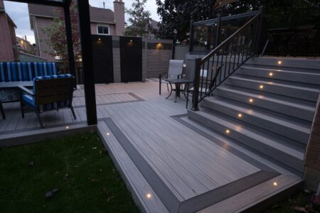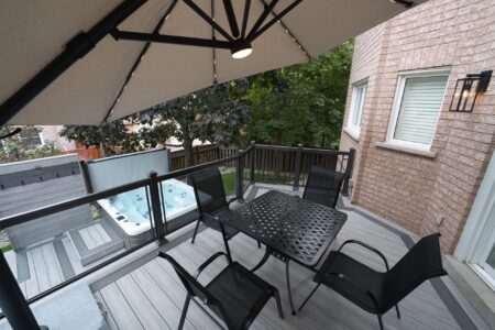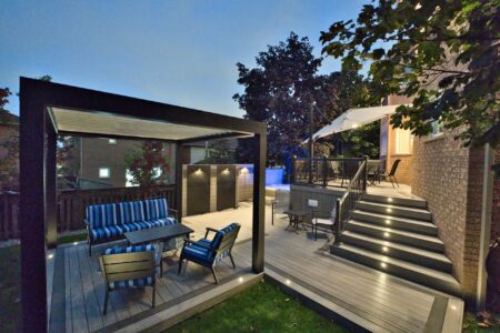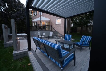 This Mississauga backyard was completely transformed from an outdated, unusable space into a modern multi-level retreat tailored to the customer’s vision. Designed and built by our team, the layout breaks away from traditional right-angle lines, creating a dynamic flow that perfectly complements the home. A smaller upper deck off the main floor provides space for a BBQ and intimate dining, while a few steps down lead to a spacious lower deck—now the main gathering area. This level features a louvered pergola with seating and a fire table, decorative privacy screens, integrated lighting, and thoughtful details like towel hooks for the nearby hot tub. The entire yard was regraded to support the new design, creating a functional and stylish outdoor living space.